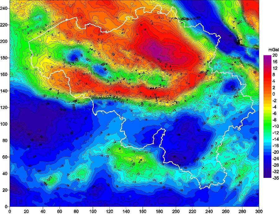 Figure : Gravimetric anomalies (Bouguer, in mGal [1 mGal $\Leftrightarrow$ 10 µm/s2 $\Leftrightarrow$ 0.001 g]) in our regions. This map reflects the variations in density of the underground rocks. It allows a visualization of large regional geologic structures. The Brabant Massive, composed of denser rocks, is the red part in the northeast of the map. The blue part corresponds to the influence of the less dense rocks in the Ardenne and the Paris Basin. The Roer Graben, in blue in the northeast, consists in an accumulation of less dense and more recent sediments.