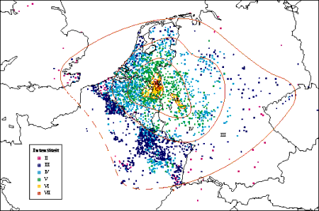 Figure 2: Transfrontier macroseismic map of the Ms 5.4 1992 Roermond earthquake (Haak et al. 1994). Intensity VII was assigned to the Roermond epicentral area.
