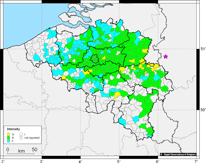 In 2011, the Erdbebenstation Bensberg (BNS, University of Cologne) joined our web-inquiry. German citizens can now submit their experience of a felt earthquake to the BNS network and based on the responses a Belgian – German macroseismic map is generated in real-time. This transfrontier macroseismic collaboration is a unique concept in the world!