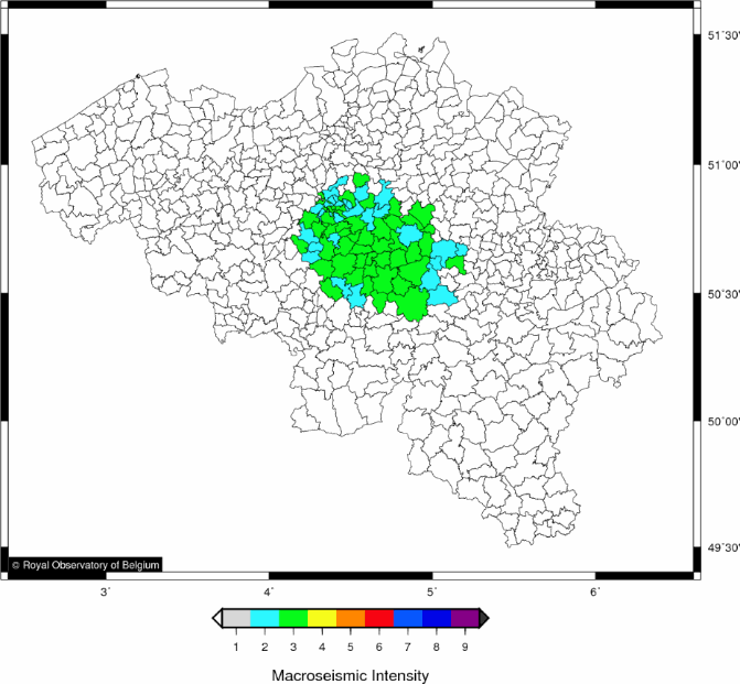 Between 2008 and 2010, 237 earthquakes with magnitudes between ML -0.7 and ML 3.2 occurred south of the small town of Court-Saint-Etienne (Walloon Brabant Province, Belgium) (Van Noten et al., 2015a). During this 2-year period, 60 of the 237 measured events were felt, which resulted in an enormously-rich database of 11040 responses. Remarkably, also very small events and shallow events were perceived by the local population: e.g. 5 responses for the 21 October 2008 ML 0.4 event. The fact that these responses were submitted even before any information was placed on the website makes us confident that this event was really perceived.