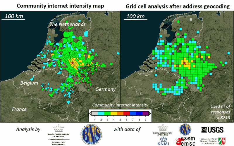 In 2014, we developed an in-house geocoding algorithm to geolocate the submitted addresses of the responses to detailed geographical locations up to the street level or better. In a community macroseismic map, the intensity distribution is often spread inhomogeneously due to the irregular municipality shapes. Since 2015, the intensity of geocoded locations are grouped in equally-sized grid cells. To each grid cell, an intensity is assigned in a GIS environment. This representation (see Figure 5) allows us to map the felt effect in a more homogeneous way than in official communal or community internet macroseismic maps. Because people do not always provide their address, a grid cell map generally does not embody all reports (~80-90% of total data).