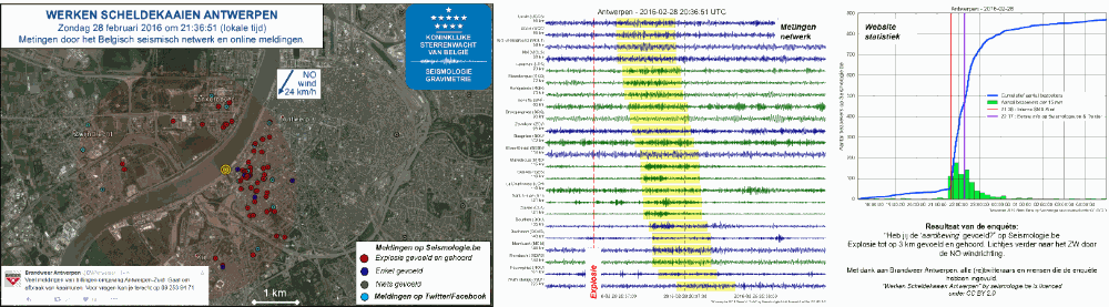 Figure 7: Felt and heard testimonies to the Antwerp construction explosion on 28 February 2016. Sources: Seismologie.be, Twitter and Facebook.