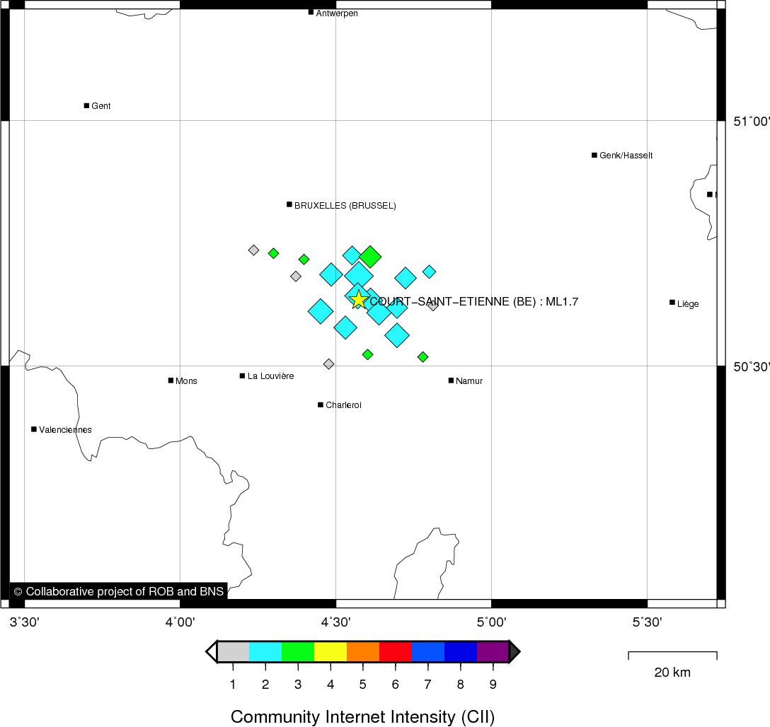 Epicentral coordinates 50.635° N, 4.574° E Uncertainty ± 0.7 km