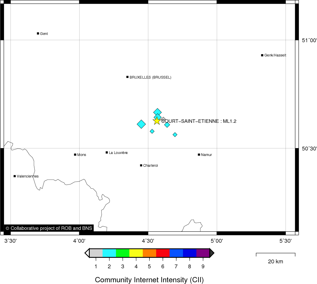 Epicentral coordinates 50.627° N, 4.565° E Uncertainty ± 0.9 km