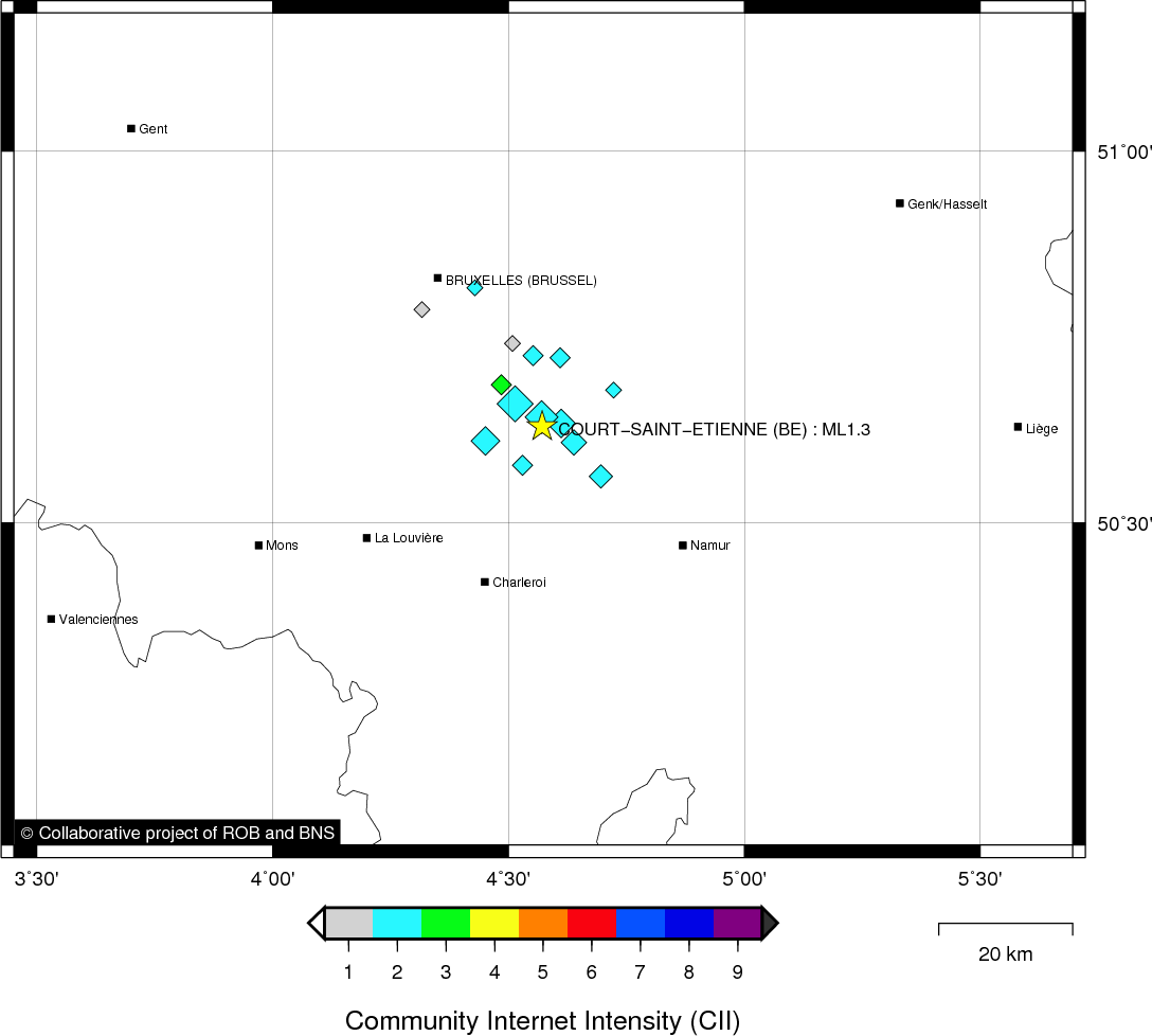 Epicentral coordinates 50.631° N, 4.572° E Uncertainty ± 0.7 km