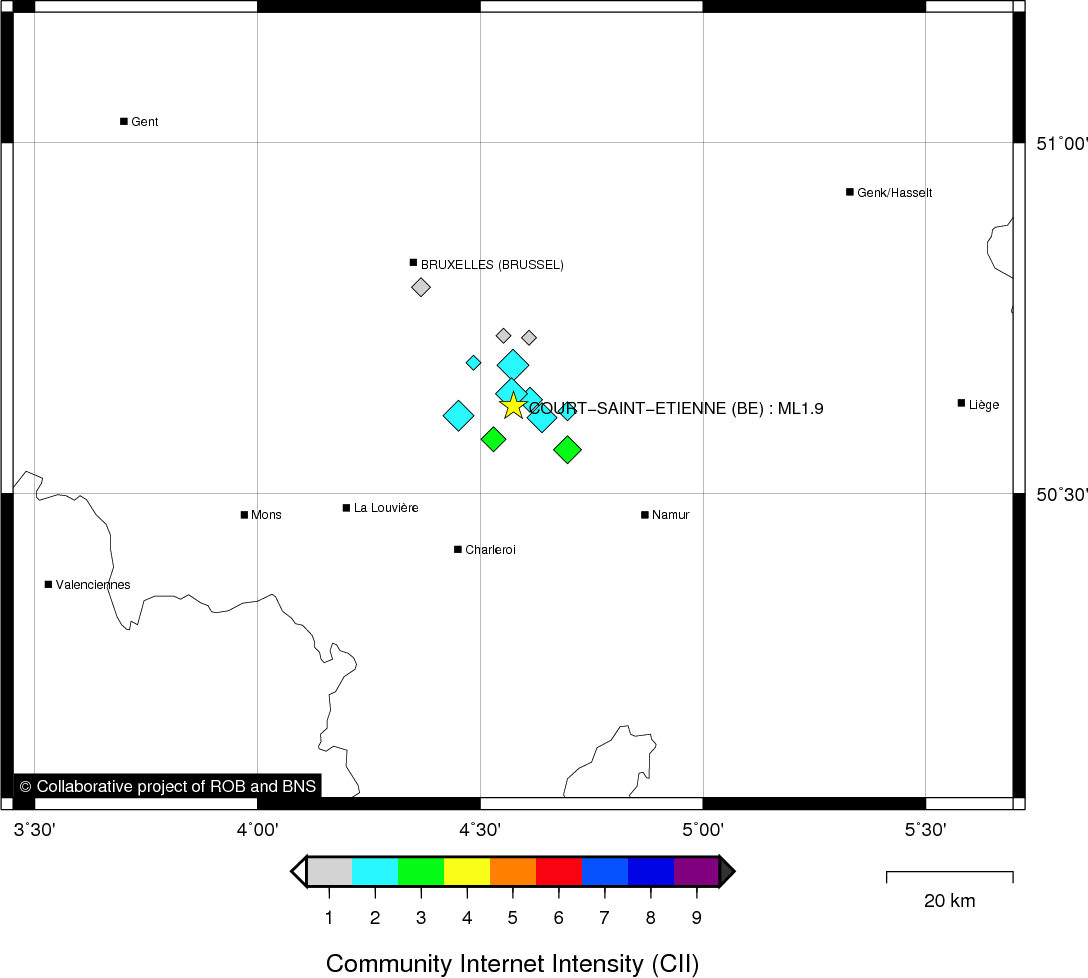 Epicentral coordinates 50.625° N, 4.575° E Uncertainty ± 0.5 km
