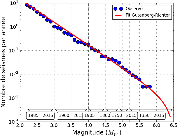 2. Dans une 2ème étape, on détermine l'activité sismique de chaque zone: à quelle fréquence des séismes d'une magnitude donnée s'y produisent-ils, quelle est leur profondeur moyenne, quelle est la magnitude la plus élevée qu'on puisse attendre ? Pour chaque zone, on calcule la relation entre la fréquence des séismes (nombre/an) et la magnitude. Cette relation est également appelée « loi » de Gutenberg-Richter.