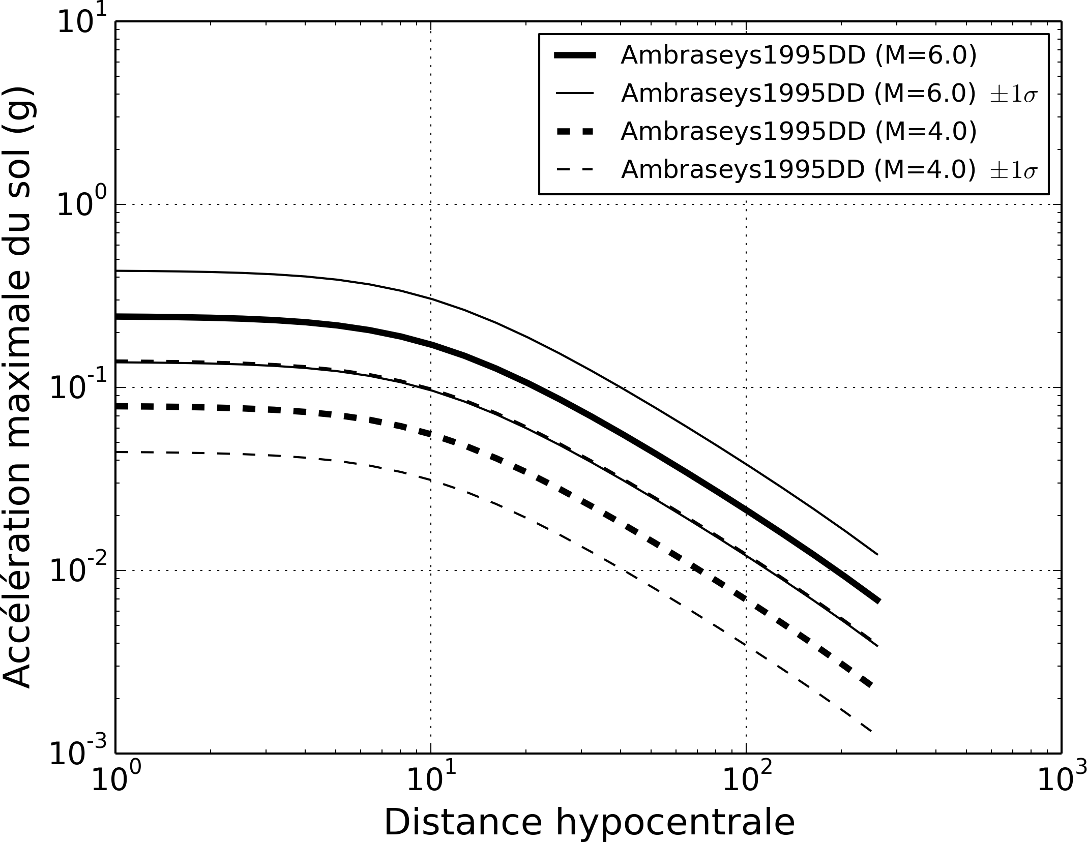 Figure 3 - Relation entre l'accélération maximale au sol et la distance épicentrale pour des séismes d'une magnitude 4 et d'une magnitude 6 à une profondeur de 10 km, selon la loi d'atténuation d'Ambraseys (1995). Cette loi d’atténuation a été appliquée lors des calculs de l’Eurocode 8; cependant, lors d’études plus récentes, l’on utilise la plupart du temps d’autres modèles de mouvements du sol récemment développés