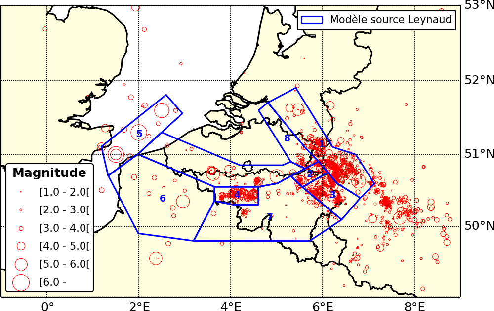 1. Dans une 1ère étape les zones de sources sismiques sont délimitées. Ce sont des zones présentant une certaine activité sismique et pour lesquelles on admet que des tremblements de terre s'y produiront aussi dans le futur. On admet qu'à l'intérieur de chaque zone, les caractéristiques des séismes et la probabilité qu'ils surviennent sont constantes.