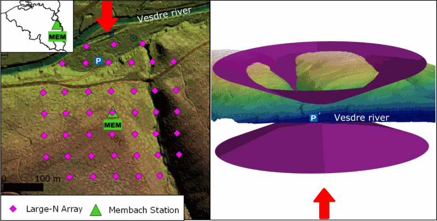 The objective of this LARGE-MEM is to provide, for the first time, an independent measurement of the actual water mass involved in the relative velocity variations observed under a dense network. To achieve this, we will install a LargeN array, i.e. a mixture of roughly 40 one- and three-component seismic sensors, on a regular grid (400x400m) covering the forested hill above the Membach underground laboratory for a minimum duration one month (Figure 1). Using the cross-correlation, the cross-component and the auto-correlation techniques (De Plaen et al., 2016; Lecocq et al., 2014), we will compute the empirical Green's functions between all sensor pairs, for each sensor with itself, and between all sensors and the Belgian Seismic Network permanent seismic station BE.MEM located in the underground laboratory. Relative velocity changes in different frequency bands will be computed using the stretching, the cross-spectral and the dynamic time warping methods. The instrumental layout of the experiment will allow using Rayleigh and Love waves (thanks to the three-component sensors) and also body waves travelling within the hill, between the laboratory and the surface.